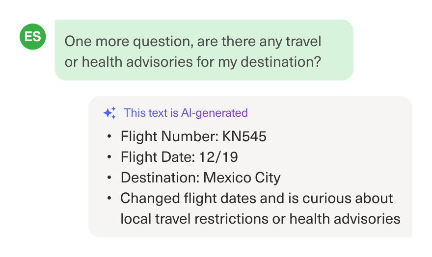 Instant summaries of customer conversations with chatbots and/or other agents prior to a transfer.