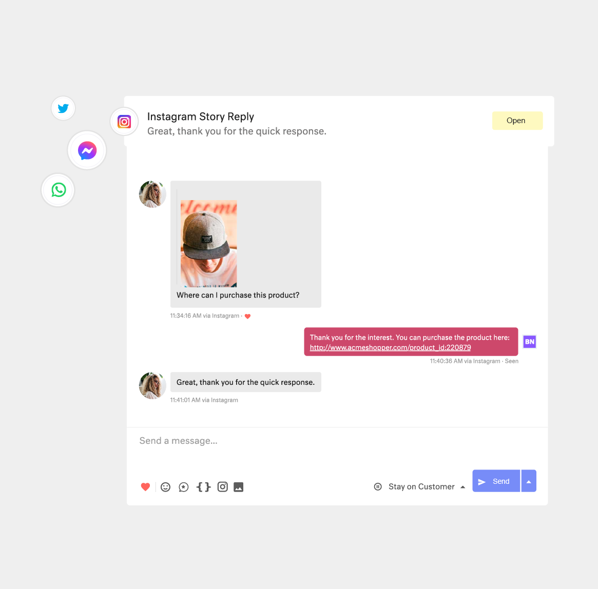 No more switching tabs. Support conversations across Instagram, WhatsApp, Facebook, and Twitter from a single workspace.