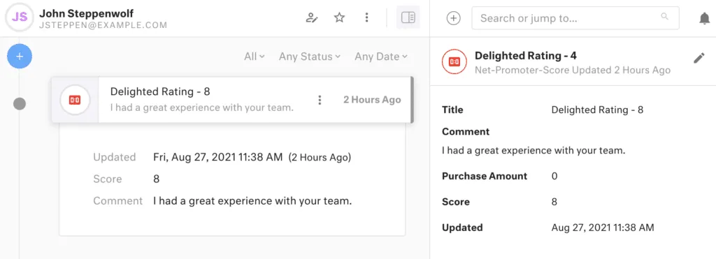 The Delighted integration empowers agents to view customers’ NPS scores every time a survey response is updated or created. Customers’ latest NPS scores will be reflected in the customer’s profile and timeline so agents can better understand how to alleviate pain points for customers with lower feedback ratings.