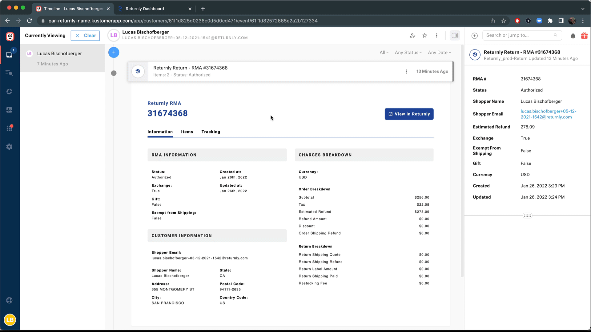With Returnly, you get everything you need to automate and manage your returns and exchanges. Set your policy, control your brand, and start automating your returns workflow to free your team to focus on your customers. When integrated with Kustomer, Returnly displays relevant return and exchange information directly in the timeline and links to the associated RMA to help your team deliver faster, more personalized support.