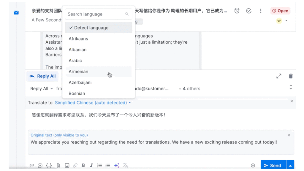 This new feature to the Agent Co-pilot suite aims to further supercharge support teams. The 2-way translation feature (powered by AWS translation service) lets agents easily translate both customer messages and their replies directly within a conversation.