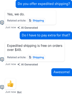 We’re excited to share that we’ve supercharged our bot experience with AI Responses. The AI response interaction uses OpenAI to respond to questions in your chat assistant using information found on your public knowledge base, bypassing the need to engage with a support rep. What’s more, you can easily set up AI responses in a few clicks, by adding AI interactions to a custom chatbot that includes intents, or by selecting a “Respond with AI” template that does the work for you.