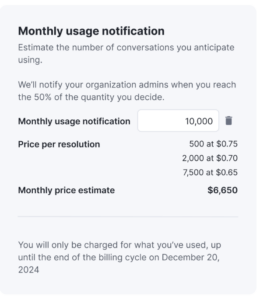 Monthly email notification alerts can be set up by admins to trigger when 50%, 80%, and 100% of their paid conversation allotment is used.
