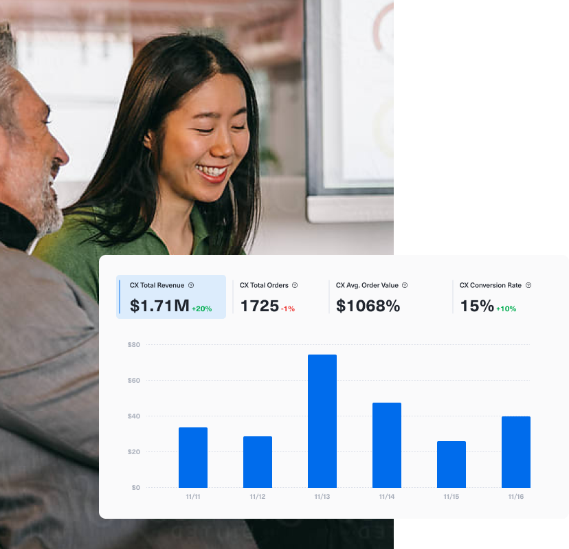 Create custom reports to uncover trends, improve efficiency, and boost CSAT. For example, create a report to track how many customers served by your team made repeat purchases or increased order value.
